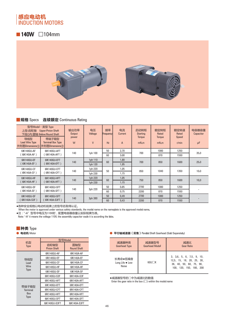 電機特性:感應電機,可逆電機,調速電機 ,剎車電機可選。